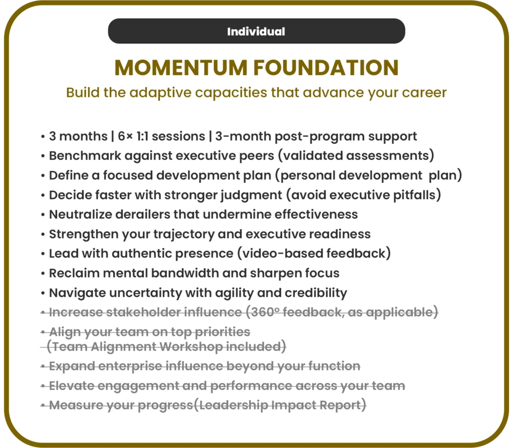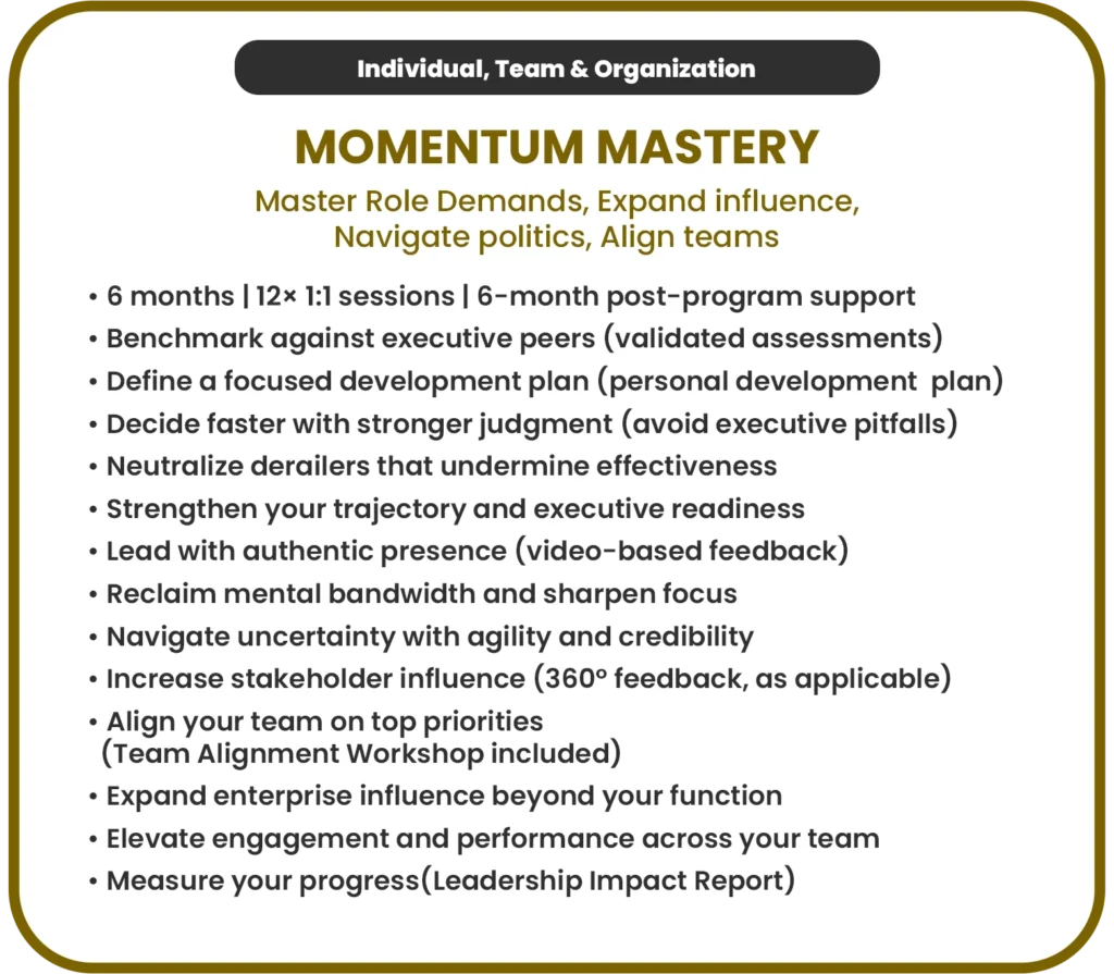 He is the founder of Momentum For Leaders and the creator of AdaptX™, two science-backed, AI-enabled executive coaching systems designed at accelerating leadership transition, succession planning and career advancement.